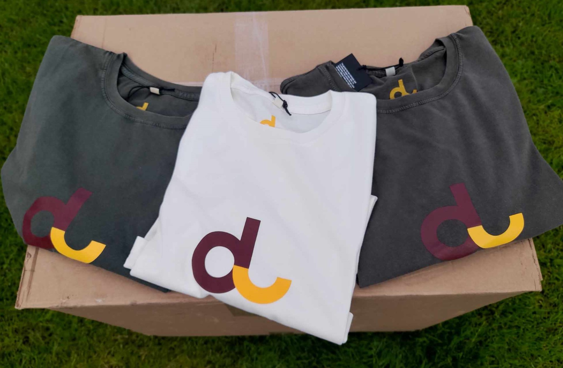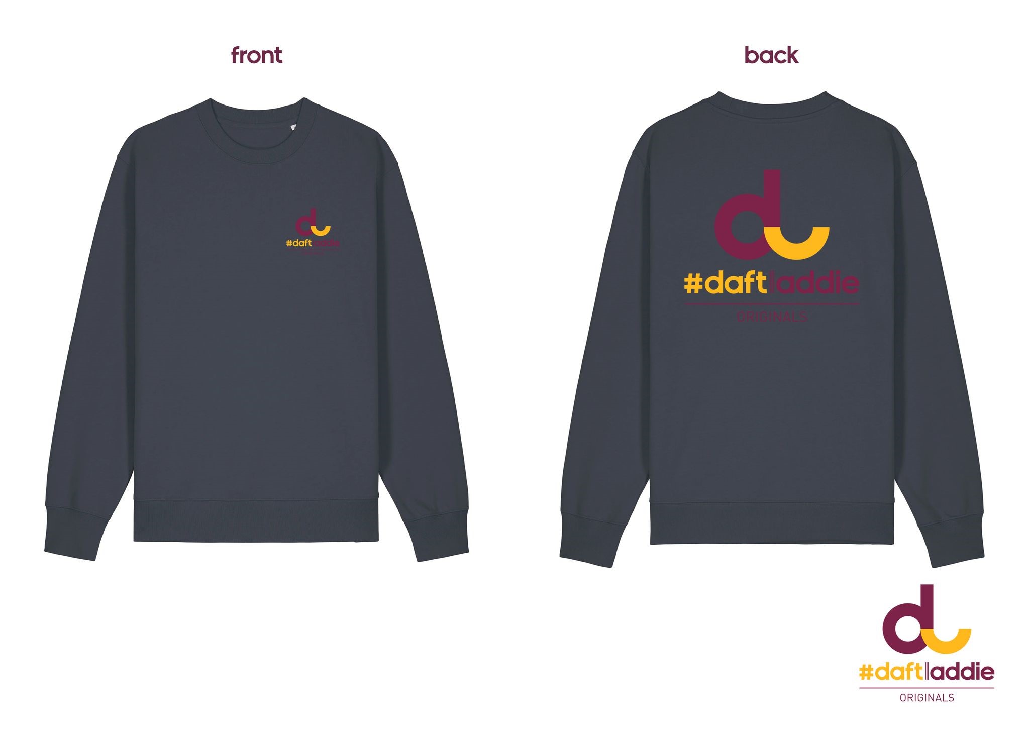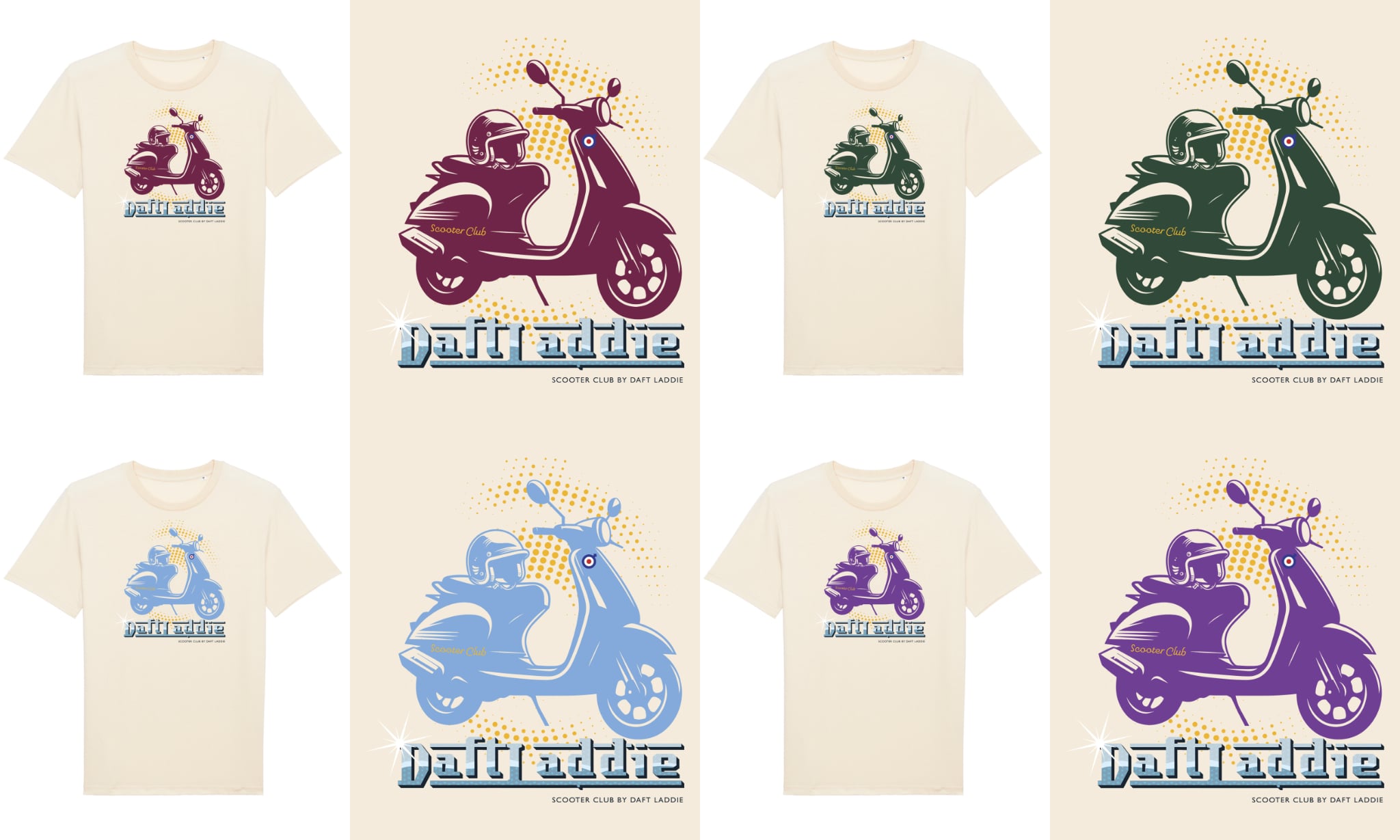 Branded Tees are obviously something which serve a dual purpose, advertising the brand at the same time as being the latest addition to the brand design portfolio. It’s important for it to be a good design in its own right though, not just an easy way to add to the range. I always felt Daft Laddie wasn’t the kind of brand that needed to big itself up, instead I preferred to let the artwork do the talking. But I was persuaded differently not long after I started and the logo design was the result. Firstly in Navy on a beige tee, later Yellow on Navy. I went for Claret & Amber on a white tee with the dual purpose of having these duffel bags produced. Not enough demand for the bags to warrant a run on their own so I combined the print run with the tees in order to make it cost effective.